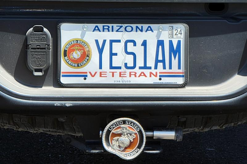 "Yes siree!" One would guess that this veteran's license plate states his or her military history quite well, with obvious pride, seen in Kingman, Arizona. Since the Marine Corps plate program began in 2015, almost 23,000 Arizona U.S. Marine Corps license plates have been sold, each contributing to scholarships for the children of Marines and Navy personnel. For Arizona residents, information on these plates can be found at www.servicearizona.com, then click on the personalized/specialized plates link.