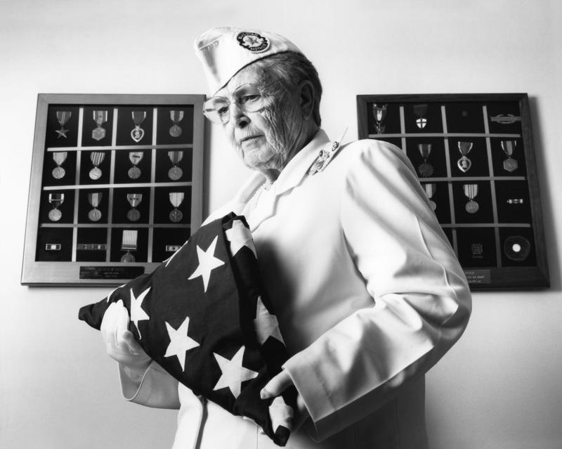 Laura Titus, Gold Star Mother, with the framed military medals earned by husband Elroy and son Jimmy.
