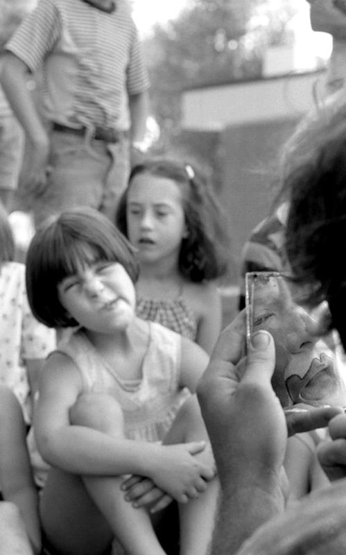 One young spectator with a questioning gaze, watching clown Harley Newman applying his circus makeup.