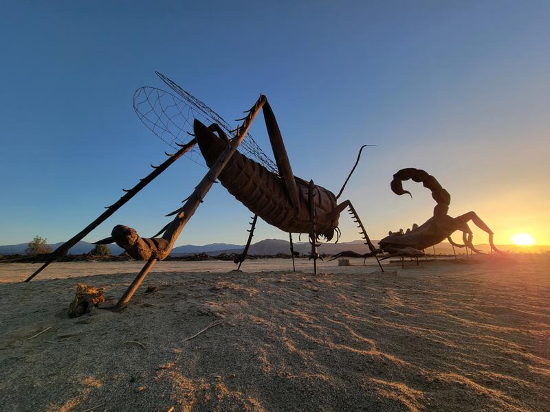 "The Scorpion and the Grasshopper" Two of Ricardo Breceda's giant metal sculptures in the Anza-Borrego Desert. Borrego Springs, California