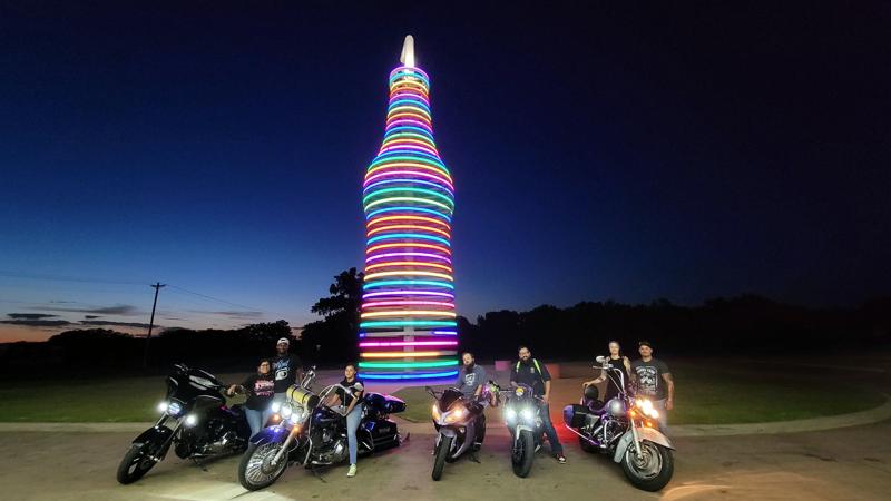 Bill Nicholson with other "405 Riders," who enjoy occasional twisties with quick bursts of speed, at Pop's 66 Soda Ranch on Route 66, Arcadia, Oklahoma.