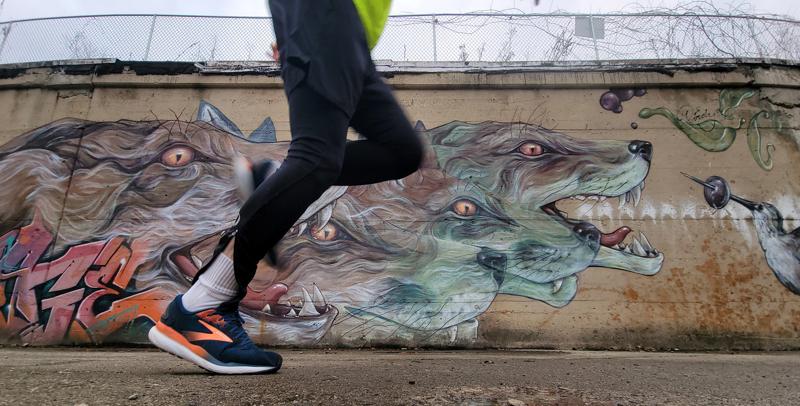 "Four Canines and a Hummingbird - and Brooks Shoes!" The beautiful Franklinton, Ohio mural was painted in 2019 by Miss Birdy.