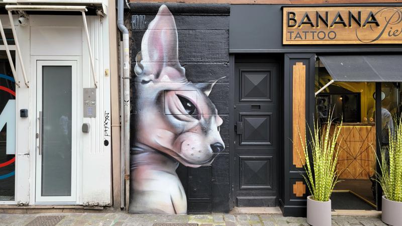 A Rouen, France street scene at Banana Tattoo & Piercings. Painted by Guillaume VINCENT, aka Ecloz.
