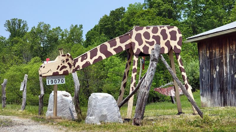 Danny Wilson's giraffe mailbox, seen on Wolf Run Road near Caldwell, Ohio.