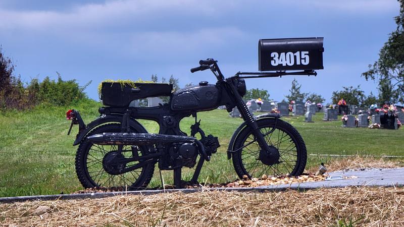 "It was a '67 Honda 90. I worked on that thing for what seemed like forever, but couldn't make it run," so I was told by Gary 'Bronson' Lawrence, the bike's owner. "The next day I was going to throw it into a dumpster, done and be gone with it," he added, "but overnight I had a dream, this dream. "Forty-three years ago I built the brackets and there it sits. It's been everywhere, in newspapers, on TV, in magazines, even in senior pictures. It's a landmark!"