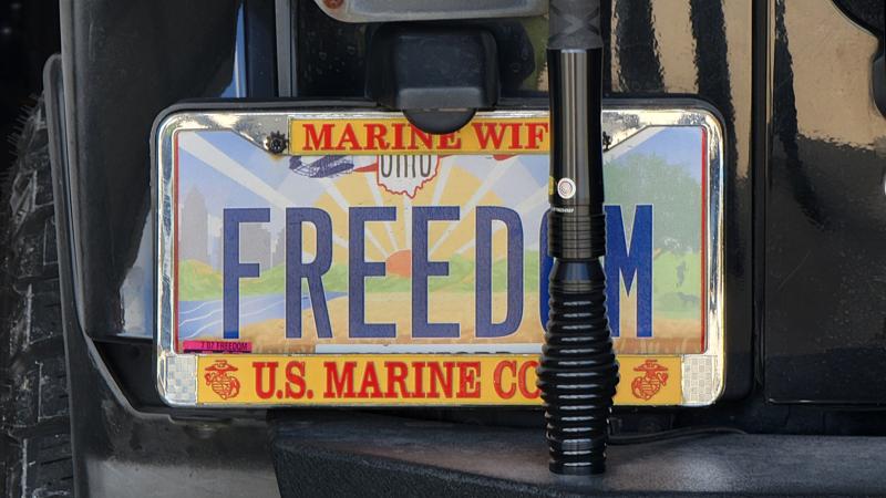 "We come from a very patriotic family, with over a dozen members who have served in the military, many of them with the Marines." So said Tina Hurst, whose husband Bruce, is one of those Marines. Bruce served with a rifle company in the '90s at Windward Point on GTMO, Guantánamo Bay, on Cuba's eastern tip. He told me that he was a 0331, trained as a machine gunner. Tina's spotless Jeep, named "FREEDOM," has carried her specially requested license plate, printed as "FREEDQM" (the "Q" conveniently hidden here), since the early '20s, knowing that someone else was there first, hers requiring the slightly different spelling. The couple, who live in rural Crawford County, Ohio, fly several US flags from their fence posts for Memorial Day, the 4th of July and Labor Day holidays.
