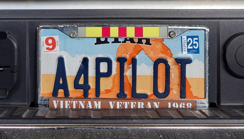 Lee Jackson never flew. He was a truck mechanic who served in Germany and at Bien Hoa, Vietnam, posted there during the 1968 Tet Offensive. The message on his plate is to honor the memory of Naval aviator John McCain, Jr., who flew the A4. The yellow and red colors on the license plate frame represent the Vietnam Service Medal, based on the colors of the flag of the Republic of Vietnam. Mr. Jackson's license plate was seen in Salt Lake City, Utah.