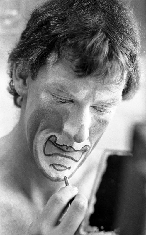 Harley Newman, one of the Hoxie Bros. Circus clowns, applying his makeup.