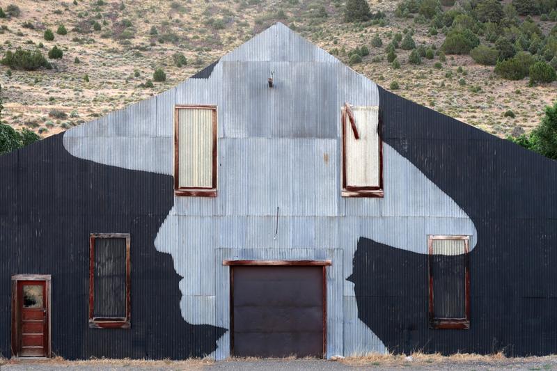 "Eureka Mark" Spray painted by Nick D'auria in 2016, one of many murals found in Eureka, Nevada.