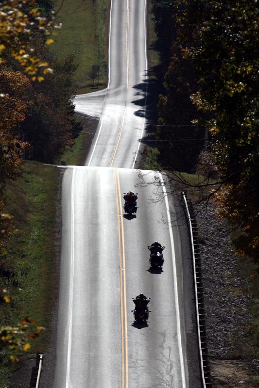 Three Harleys out on a Muskingum County, Ohio cruise, a target for riders from around the globe.