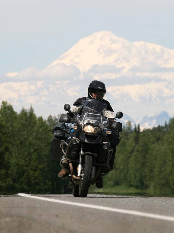 Tom Pochardt riding southbound, Alaska's Mt. Denali in the background, on the Talkeetna Spur Road.