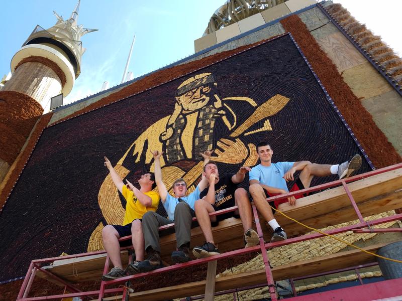 "It's the best summer job in Mitchell!" So claimed Trae VandeBerg, Matthew Krall, Calvin Gilb and Paul Bernard, posing with Willy at Mitchell, South Dakota's Corn Palace.