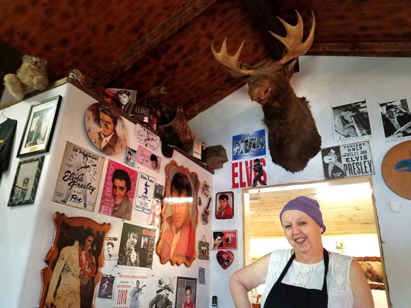 Elvis fan Linda Bouchard at her Alaska Highway Rancheria Lodge. "People bring me Elvis' from everywhere," she told me.