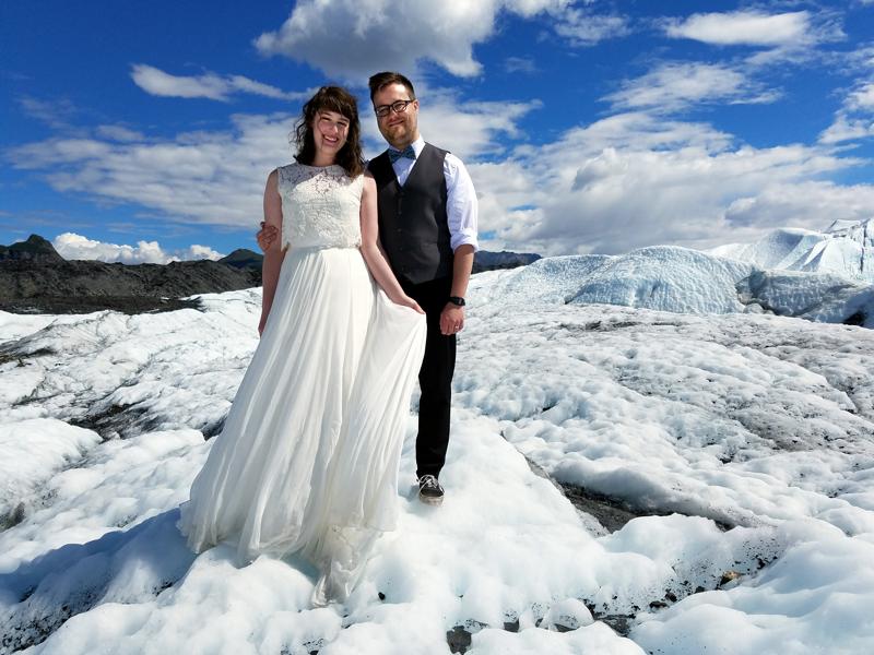 Melissa and Matt's wedding announcement picture location on the Glenn Highway's Mataluska Glacier.