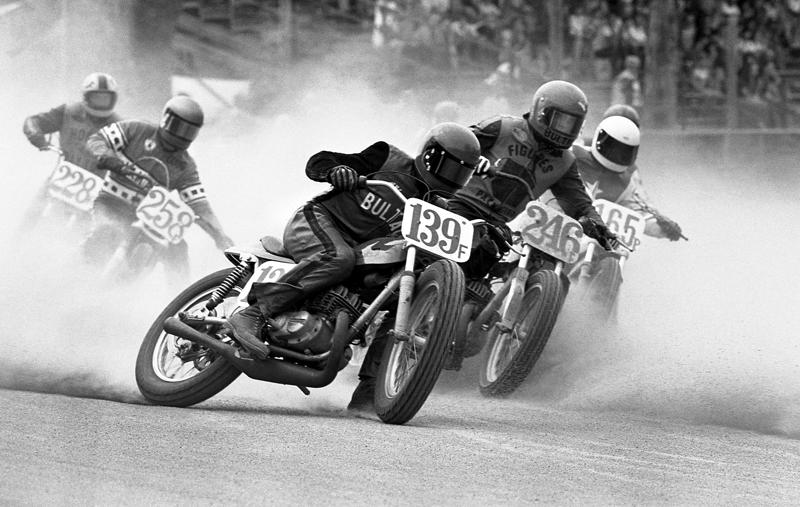 Flat track racing, on the turn for the best pictures, a few seconds before a mountain of dirt and dust.