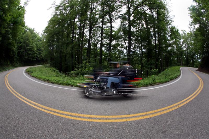 A Harley couple easing along, this rounded stretch of highway on the North Carolina "Tail of the Dragon."