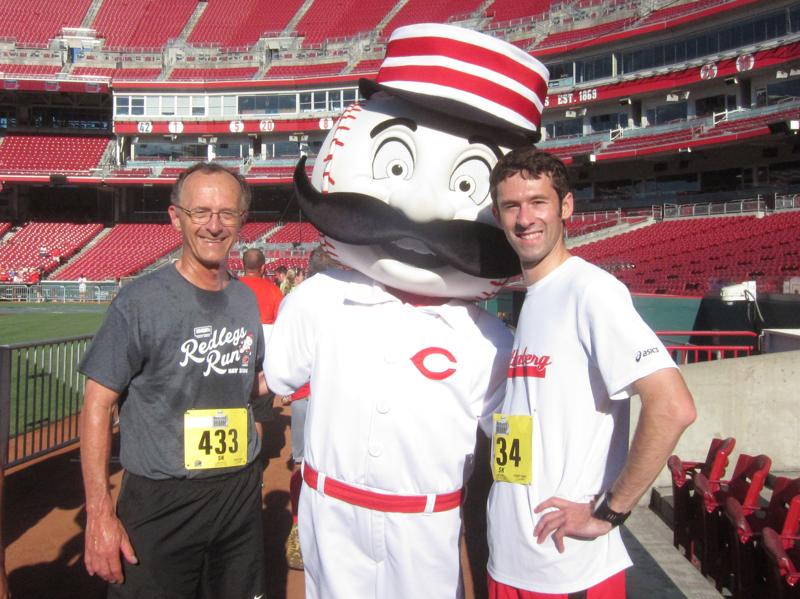 Palling around with Mr. Red, after Kev and I ran the 2014 Reds 10K in Cincinnati, the finish inside the Great American Ball Park.