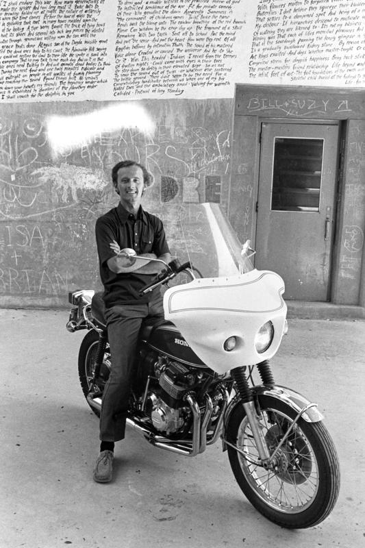 The beginning of a life-long adventure, Ken and his '72 Honda 750 at Ohio University's Seigfred Hall. Photo: Dave Levingston